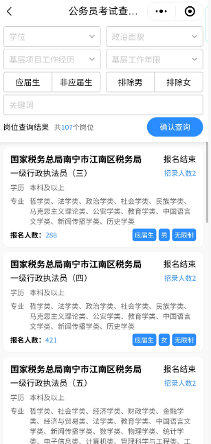 本科、漢語(yǔ)言文學(xué)專業(yè)的考生就可以看見(jiàn),截止已出崗位,自己有107個(gè)崗位可供挑選。