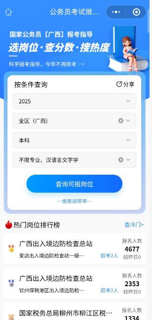 在這里,你能清晰查看各個(gè)崗位的系統(tǒng)熱度,官方報(bào)考人數(shù)、崗位報(bào)名條件,入面分?jǐn)?shù)和錄取分?jǐn)?shù),這些數(shù)據(jù)都是經(jīng)過(guò)精準(zhǔn)整理與分析的,能為你的選崗提供有力參考。