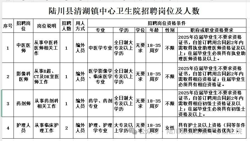 2025玉林陸川縣清湖鎮中心衛生院發(fā)布公開(kāi)招聘編外人員5人
