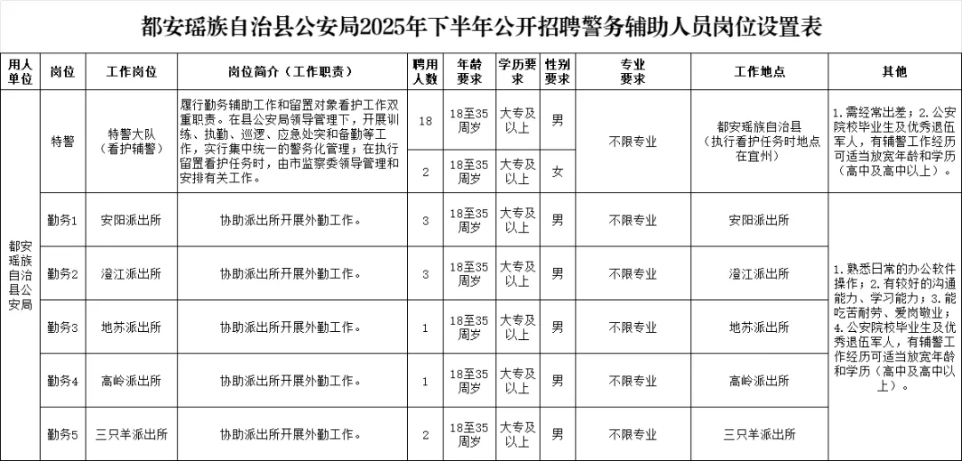 都安瑤族自治縣公安局本次擬招聘警務(wù)輔助人員30人,具體招聘崗位、人數、資格條件詳見(jiàn)《都安瑤族自治縣公安局2025年下半年公開(kāi)招聘警務(wù)輔助人員崗位設置表》。