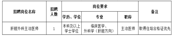 根據醫院發(fā)展需要,現面向社會(huì )急招肝膽外科主治醫師1人,有關(guān)招聘事項公告如下: