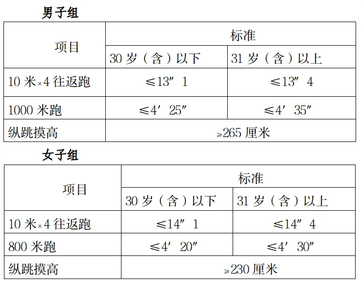 測評結果分為合格和不合格。一般體能測評三項成績(jì)均達標的方為合格,其中具有研究生及以上學(xué)歷報考人員,體能測評三個(gè)項目中有任何兩項達標的,即視為合格。體能測試時(shí)間、地點(diǎn):另行通知。