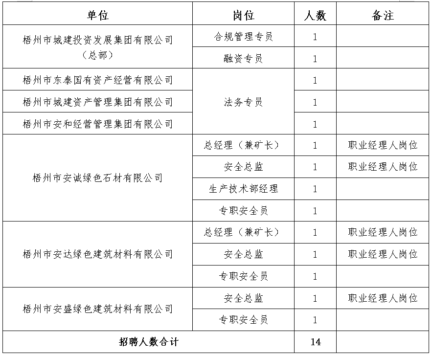 崗位要求詳見(jiàn)《梧州市城投集團招聘計劃表》(附件1)。