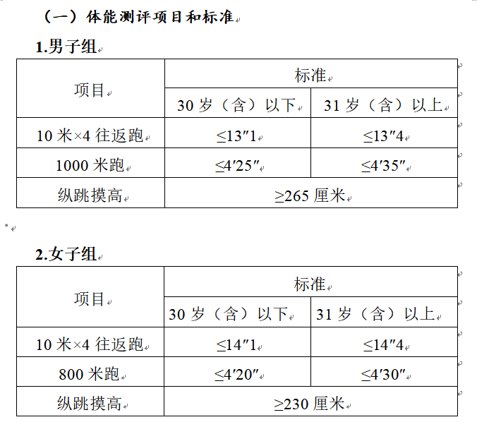 參照《關(guān)于印發(fā)<公安機關(guān)錄用人民警察體能測評項目和標準>的通知》(公政治〔2024〕60號)執行,每個(gè)測評項目分別記錄成績(jì)。其中縱跳摸高的測評次數不超過(guò)3次,10米×4往返跑測評次數不超過(guò)2次,男子1000米跑、女子800米跑測評次數均為1次。