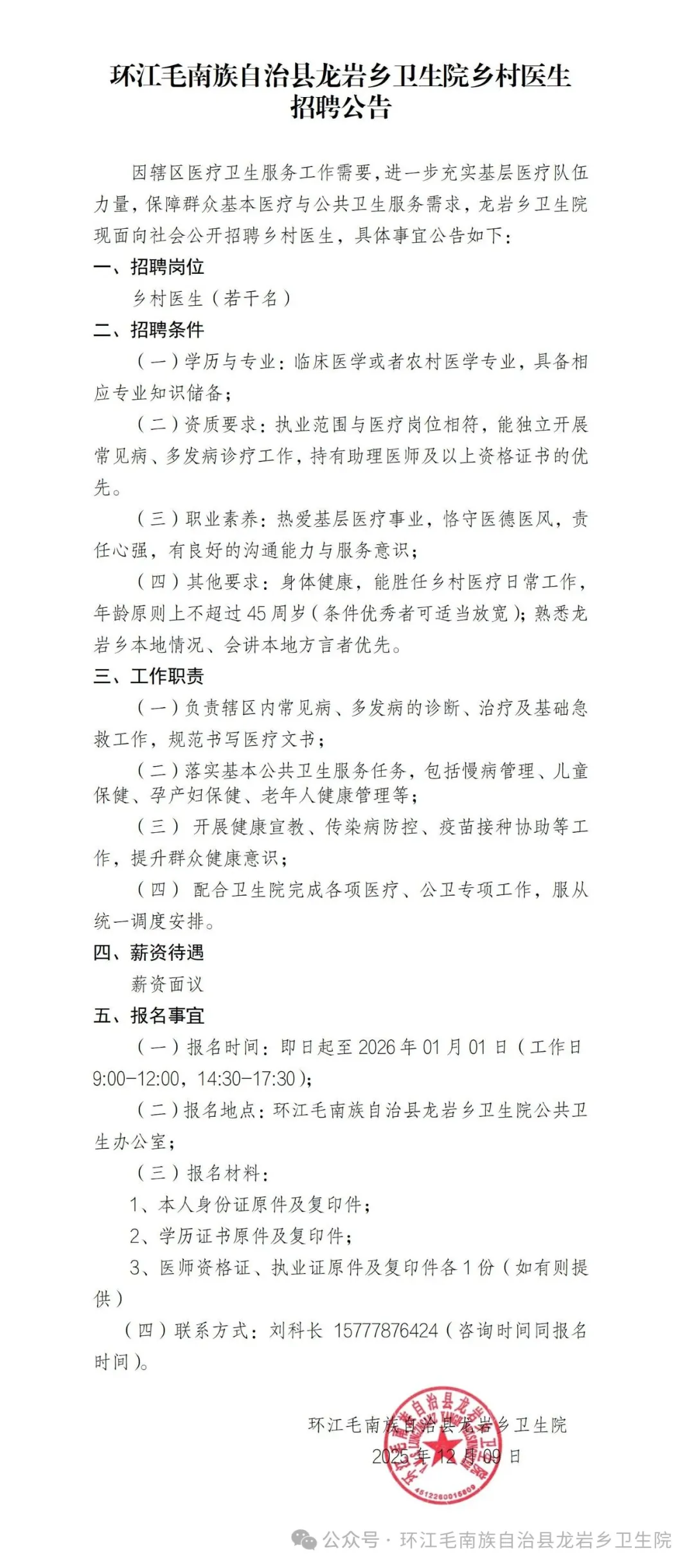 2025河池環(huán)江毛南族自治縣龍巖鄉衛生院鄉村醫生招聘若干人
