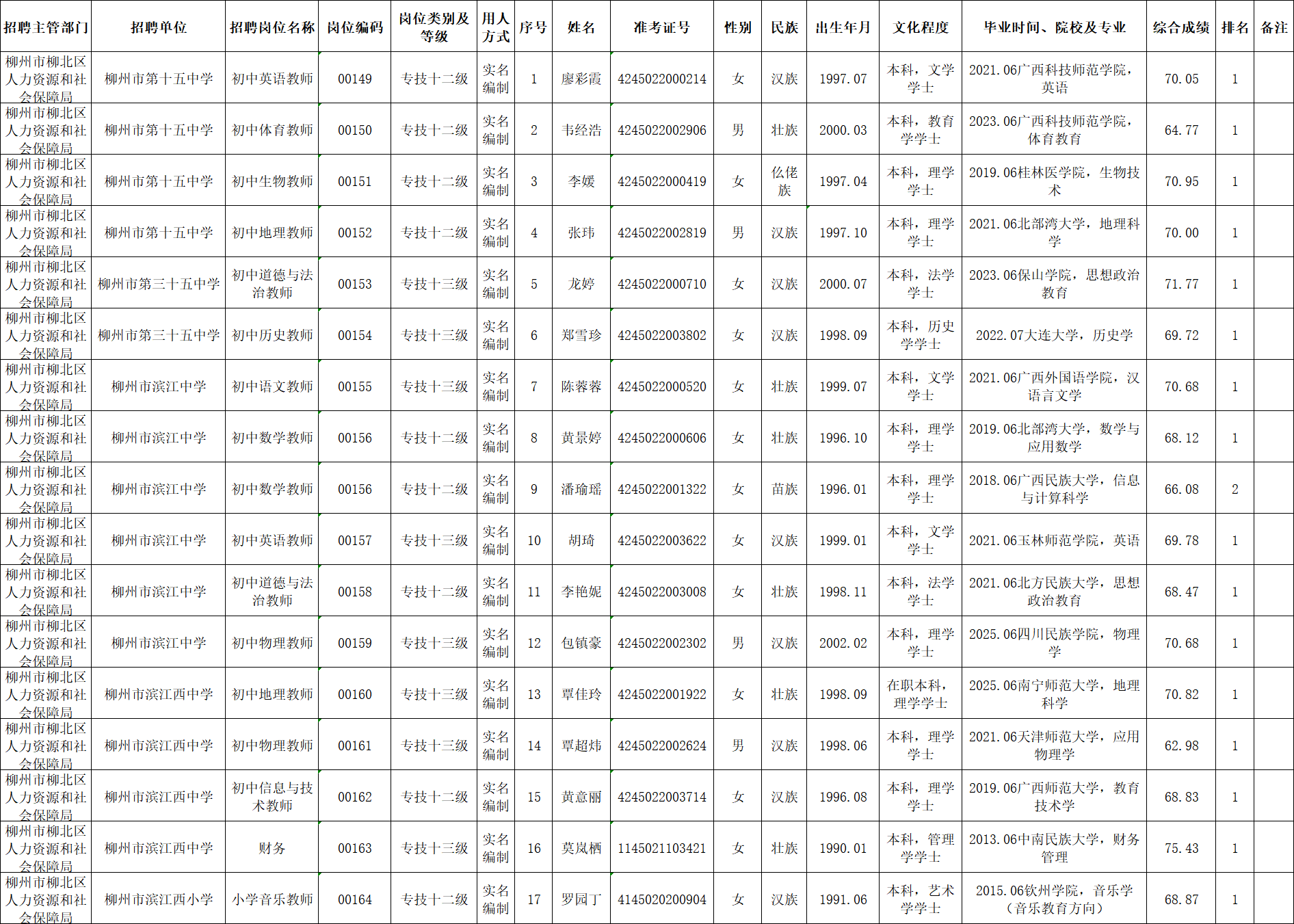 根據(jù)《柳州市2025年度下半年事業(yè)單位公開考試招聘工作人員公告》要求及安排,廖彩霞等17名同志經(jīng)面試、考察、體檢合格,符合聘用條件。經(jīng)研究決定,擬聘用廖彩霞等17名名同志為我區(qū)事業(yè)單位工作人員,現(xiàn)予以公示,公示期為5個(gè)工作日(2026年1月22日至2026年1月28日)。對擬聘用的同志如有異議,請以書面形式,并署真實(shí)姓名和聯(lián)系地址,于2026年1月28日前郵寄或直接送我單位(地址:柳州市勝利路12-8號柳北區(qū)政府3樓307室;郵編:545002,電話0772-2539121),群眾如實(shí)反映有關(guān)問題受法律保護(hù)。