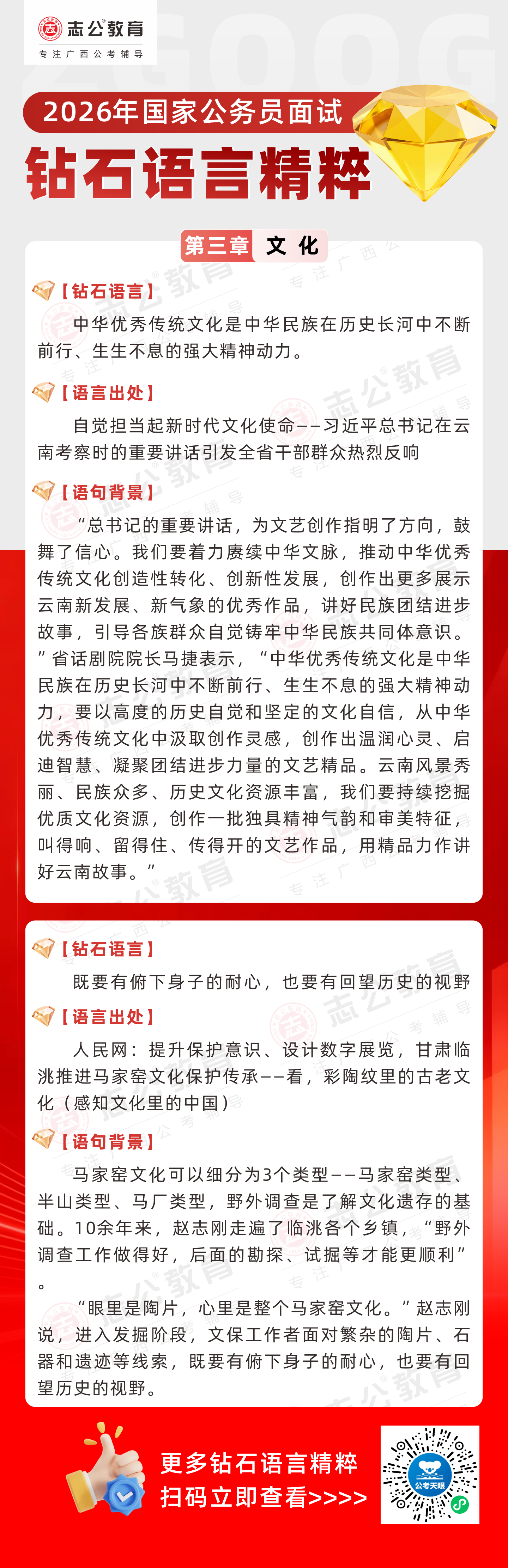 志公教育推出《2026國(guó)家公務(wù)員面試·鉆石語(yǔ)言精粹》!幫助考生把握文化類(lèi)題目應(yīng)答邏輯,提升語(yǔ)言表達(dá)層次,助你在面試中脫穎而出。備考2026國(guó)考面試,從掌握“鉆石語(yǔ)言”開(kāi)始!