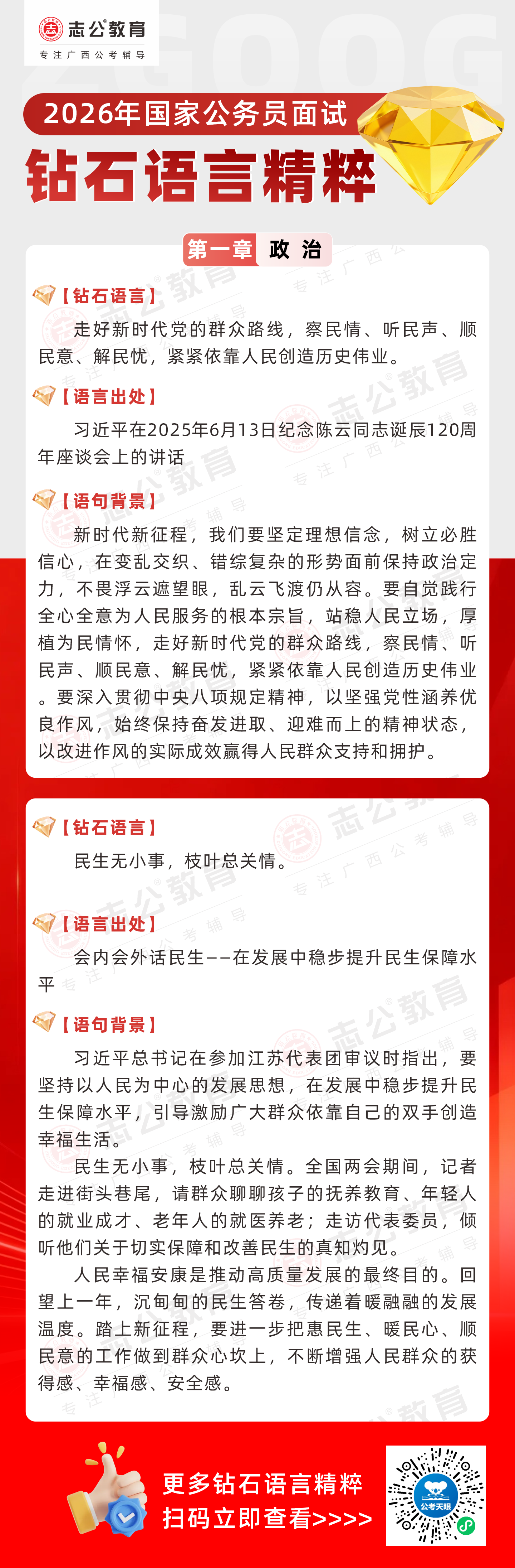志公教育推出《2026國(guó)家公務(wù)員面試·鉆石語(yǔ)言精粹》政治篇!幫助考生把握政治類題目應(yīng)答邏輯,提升語(yǔ)言表達(dá)層次,助你在面試中脫穎而出。備考2026國(guó)考面試,從掌握“鉆石語(yǔ)言”開(kāi)始!
