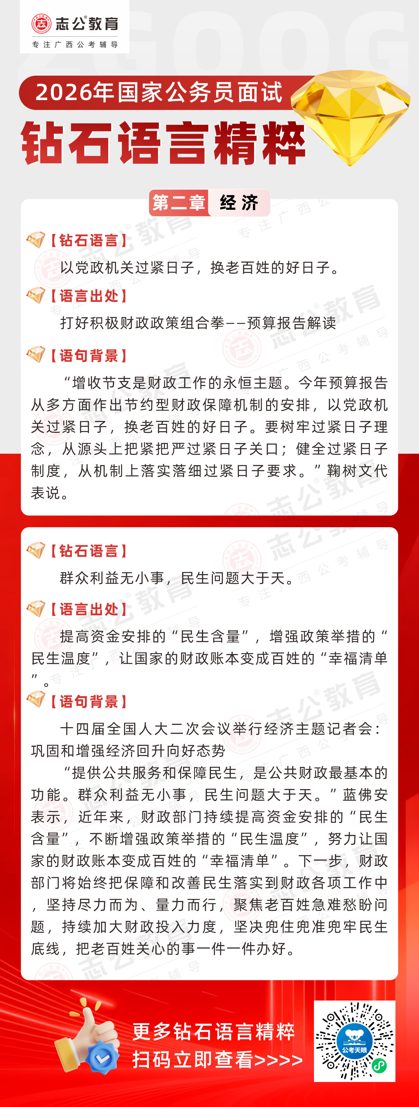 志公教育推出《2026國家公務員面試·鉆石語言精粹》經濟篇!幫助考生把握經濟類題目應答邏輯,提升語言表達層次,助你在面試中脫穎而出。備考2026國考面試,從掌握“鉆石語言”開始!