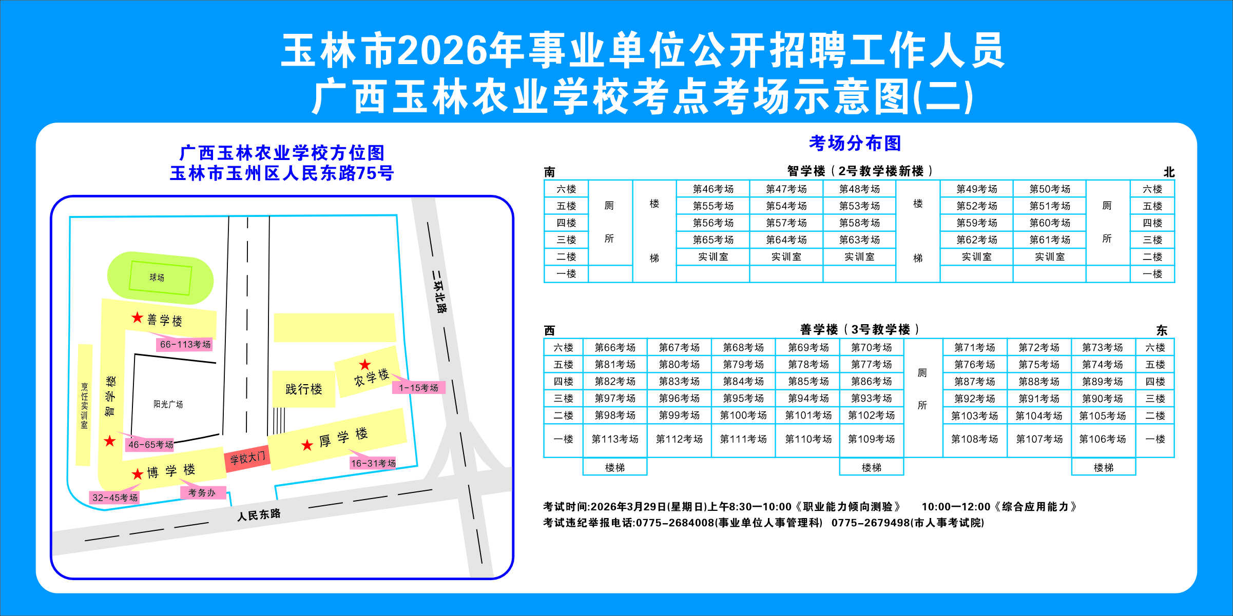 2.需要特別注意的是:玉林市第一職業(yè)中等專業(yè)學(xué)校考點(diǎn)是設(shè)在該校的東校區(qū)(人民東路東235號(hào));玉林市第一中學(xué)考點(diǎn)分為運(yùn)嶺路校區(qū)(二環(huán)北路1228號(hào))、大北路校區(qū)(大北路453號(hào))。